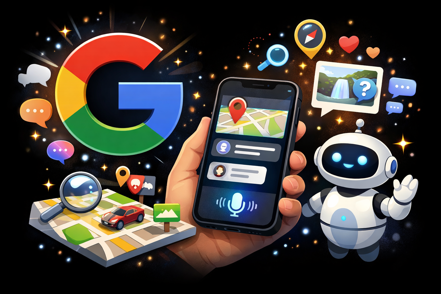 The Ask Maps feature analyzes questions and retrieves information from Google Maps data. The system considers traffic conditions, travel time estimates, and nearby locations. It also evaluates user reviews and business listings.